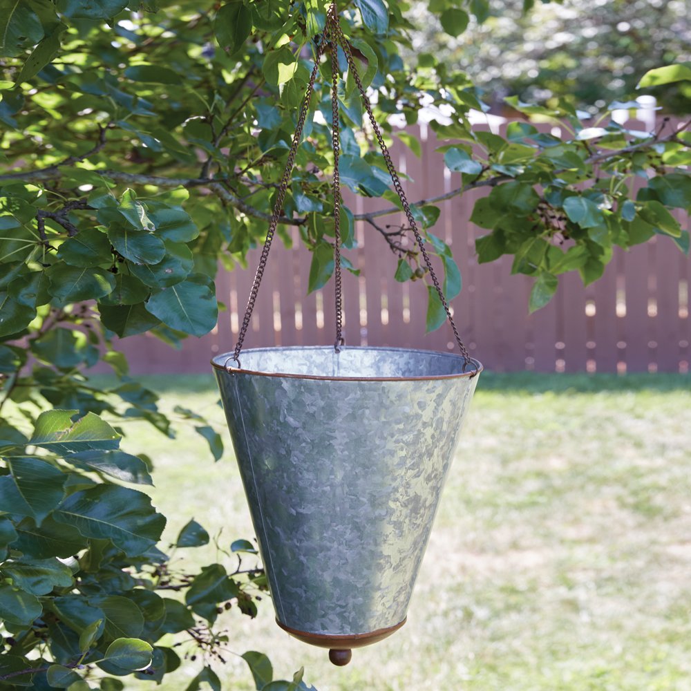 Our galvanized cone planter brings a farmhouse touch to your garden decor. Display your favorite artificial flowers inside and hang on a patio. Item is made of metal and measures 26''H when hung from the chain.